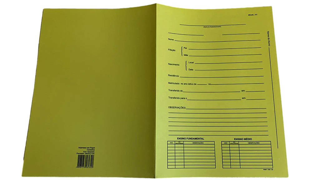 Impresso em papel cartolina 180g/m2, na cor amarela, formato 23,5x33x2,10 cm, pasta modelo 17 para primeiro e segundo graus, embalado em 1 pacote de 50 unidades.