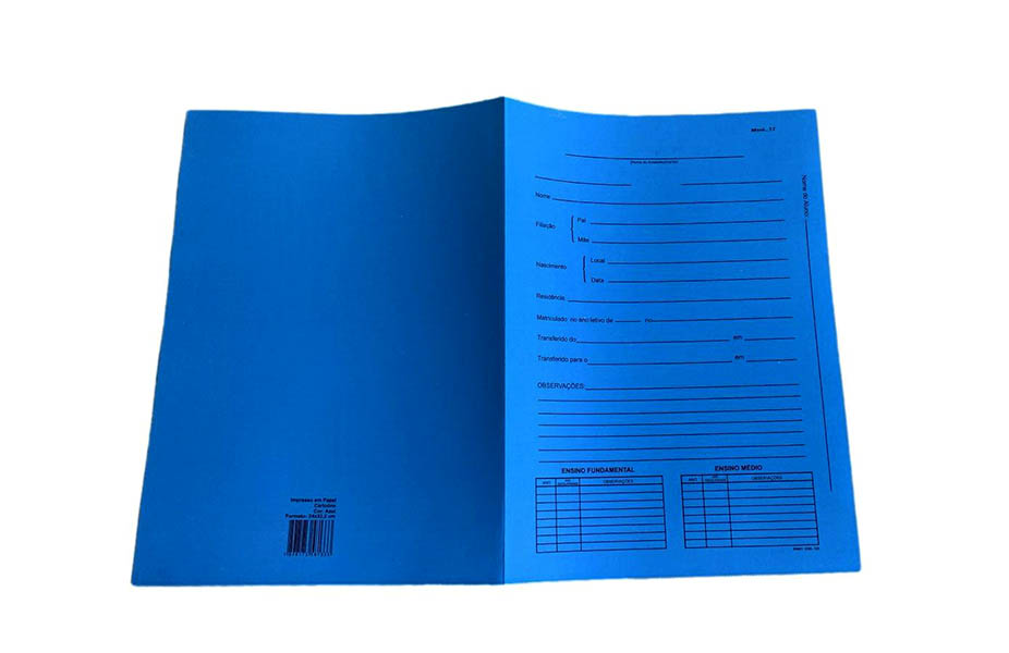 Impresso em papel cartolina 180g/m2, na cor azul, formato 23,5x33x2,10 cm, pasta modelo 17 para primeiro e segundo graus, embalado em 1 pacote de 50 unidades.